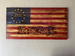 ‘The Preamble’ Betsy Ross Large Stained FlagFlag $175 • Hand-carved ‘The Preamble’ color-stained wooden Betsy Ross Flag • Dimensions: 37″ W x 19.5″ H Previous Post Betsy Ross 'We The People' Large Stained Flag Next Post 'The Pledge of Allegiance' Large Stained Flag