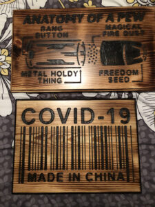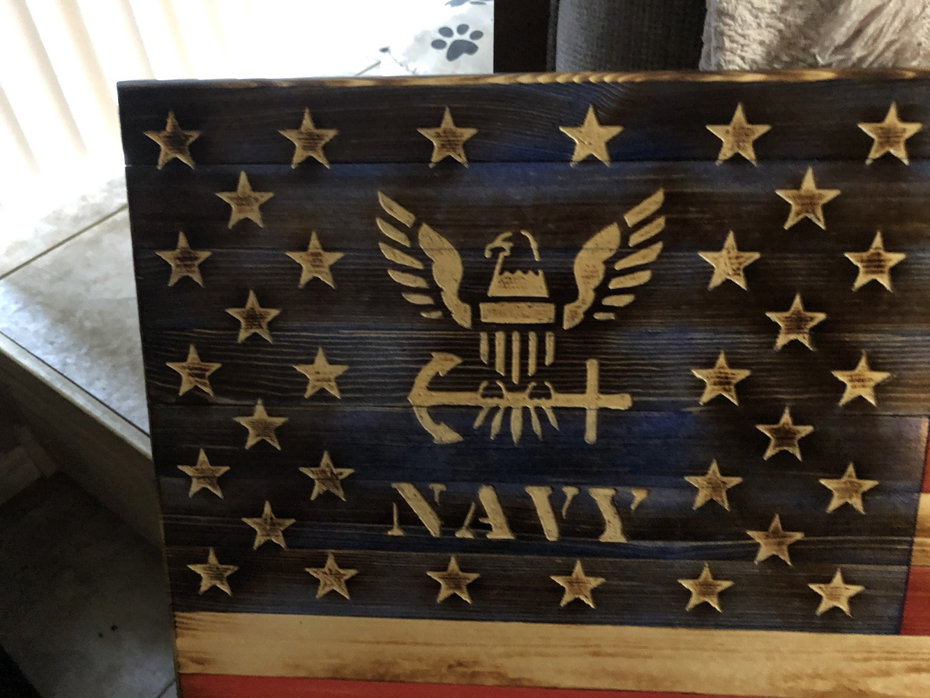 Custom Navy Large FlagCustom Example, Flag $175 • Custom hand-carved Navy Emblem with name, title and In God We Trust addition Previous Post Anatomy of a Pew Sign Next Post Cancer Ribbon Large Flag