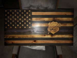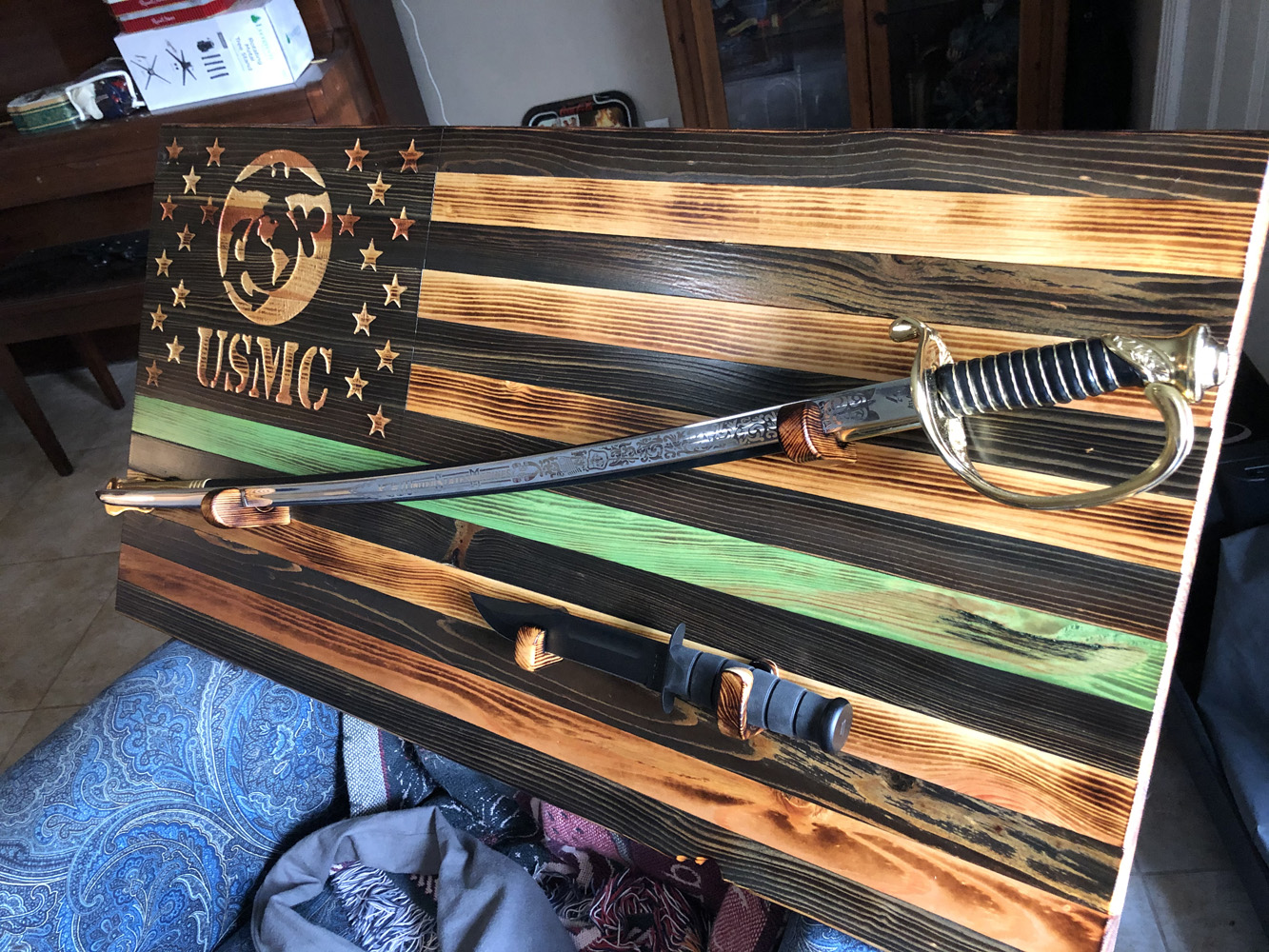 Custom USMC Large FlagCustom Example, Flag $200 • Custom large flag order with green stripe, hand-carved USMC and weaponry display Previous Post Americana Cross Next Post Custom Officer Down Large Flag