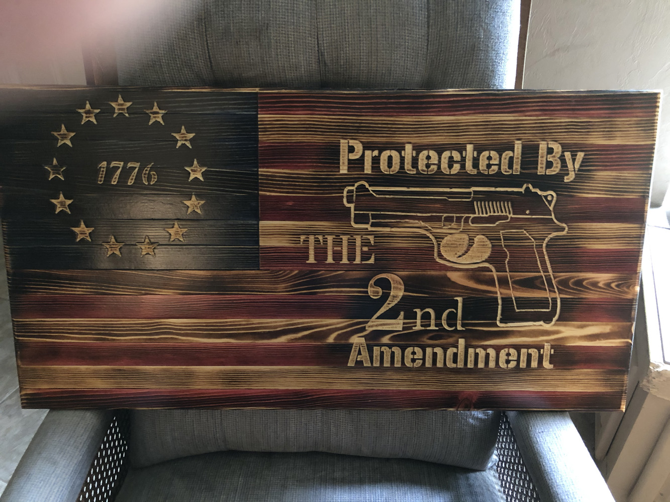 ‘Protected by the 2nd Amendment’ Medium FlagFlag $135 • Medium base flag w/ additional hand-carved ‘Protected by the 2nd Amendment’ • Dimensions: 30” W x 15” H Previous Post 18" Small 'We The People' Framed Flag