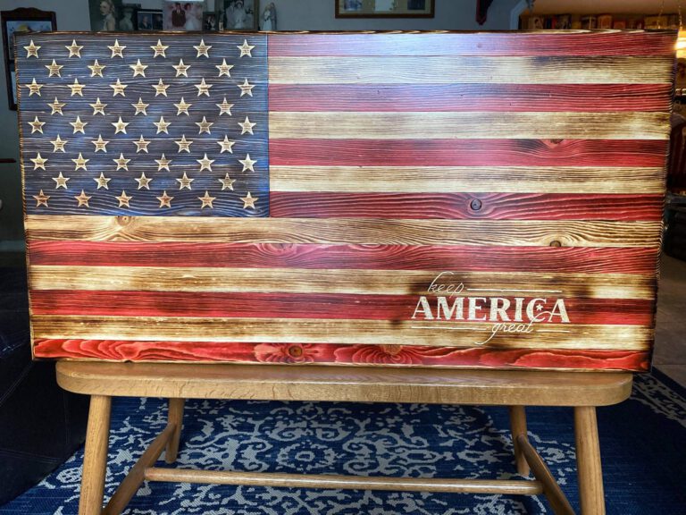 $150 • Hand-carved ‘Keep America Great’ color-stained wooden flag • Dimensions: 37″ W x 19.5″ H